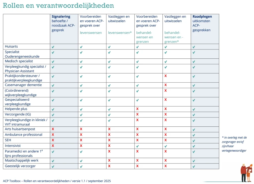In de tabel (zie download) vind je een beknopt overzicht van welke beroepsgroepen in welke fase van het ACP-proces een rol en verantwoordelijkheid hebben.